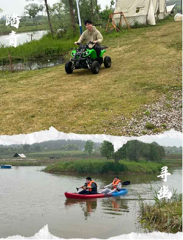 飽餐過后,大家開啟自由打卡模式,有的徜徉爛漫的鮮花林間,拍照留念;有的沉浸刺激的草坪車上,體驗激情;有的閑坐愜意的露營天幕,暢玩摜蛋;有的乘上有趣的水上劃艇,放松心情;還有的在綠草間,體驗百步穿楊、展現颯爽英姿。