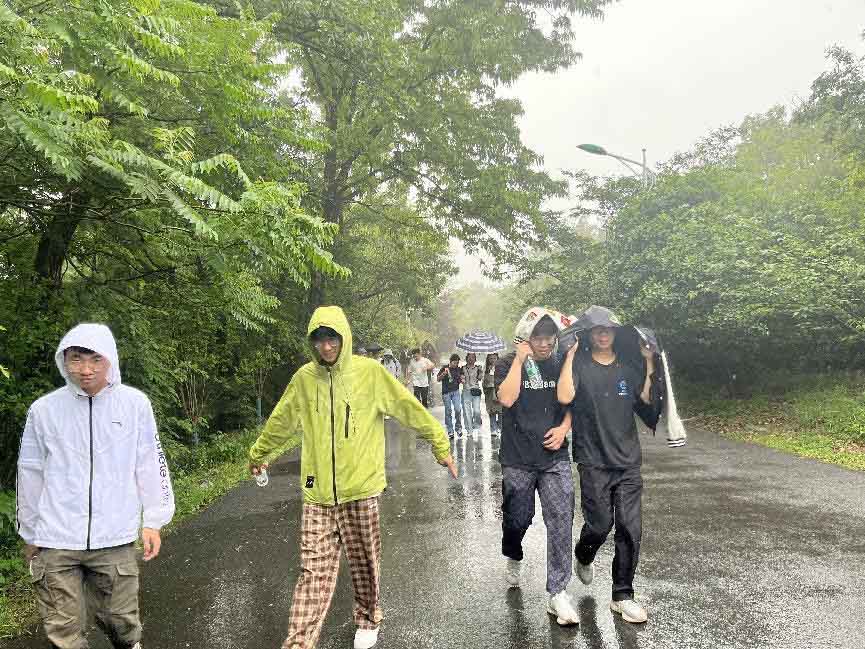 爬至山頂時,天空下起了雨。雖然雨勢越來越大,但團隊向上奮斗的精神依舊飽滿,冒著雨走在山路上也是別有一番風味。被雨水沖洗過的山體無處不在散發著清新的氣息,行走在翠綠的山林之間。張開雙臂,一種與大自然親密接觸的滿足感油然而生。